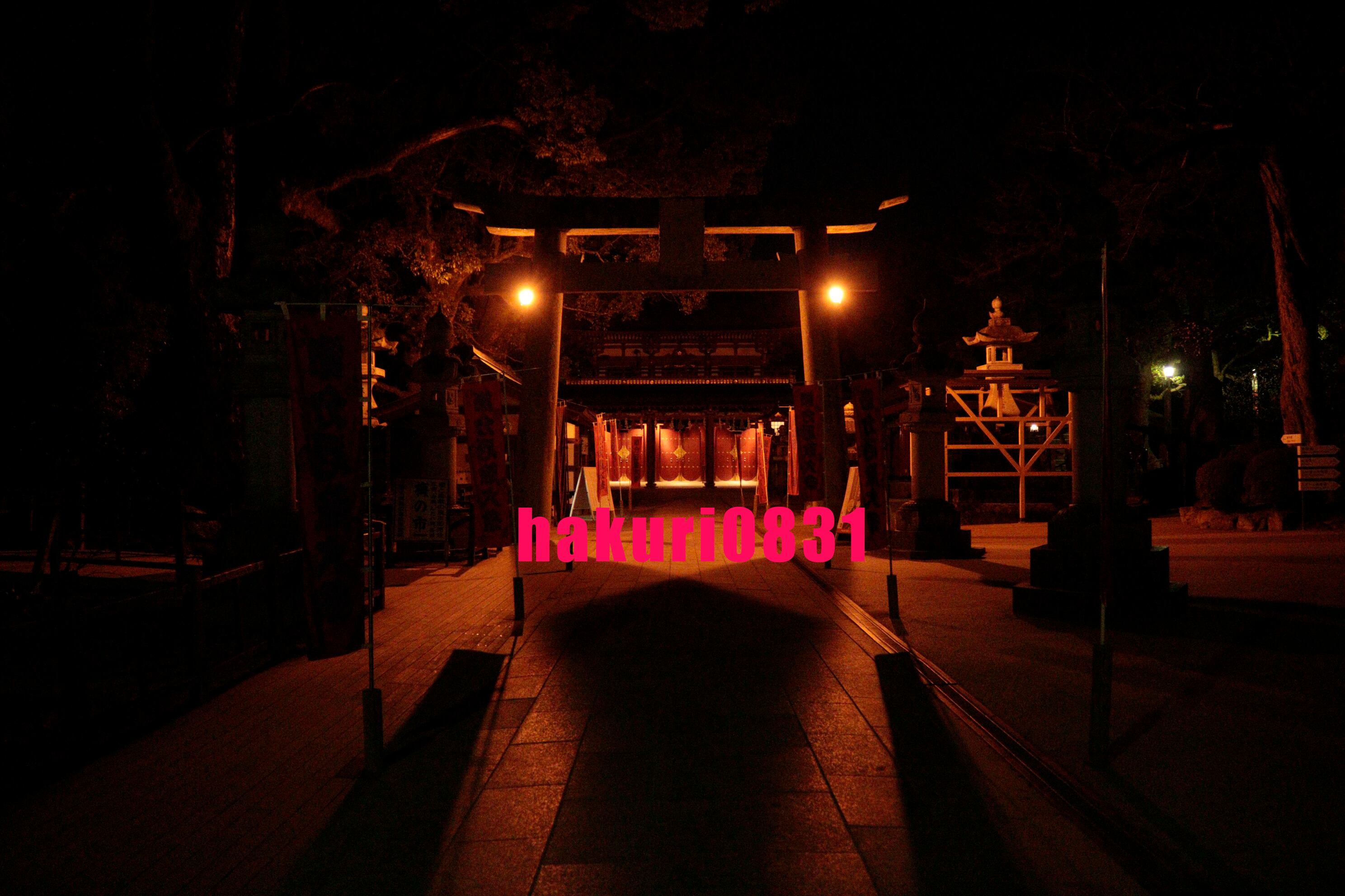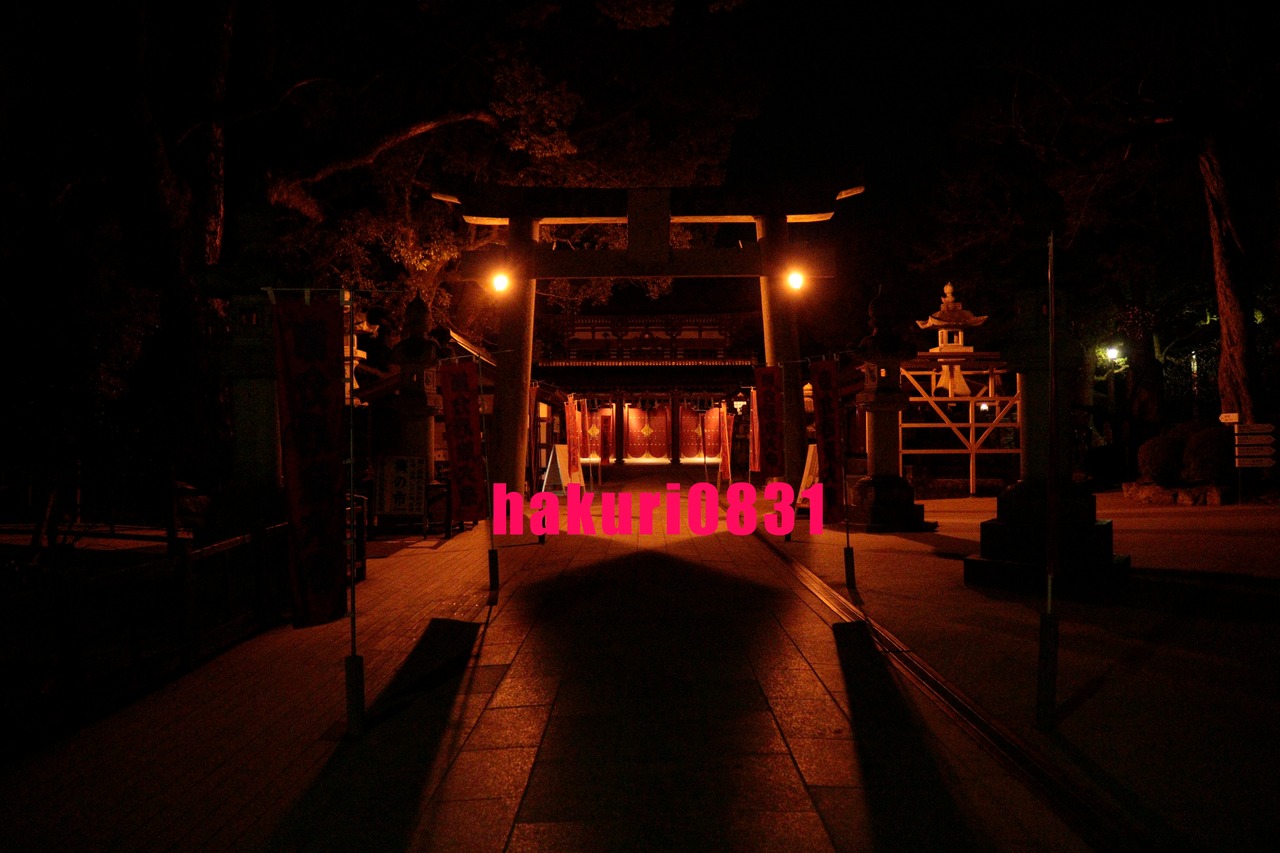 この写真は、夜の神社の静けさと神秘的な雰囲気を捉えた一枚です。灯りに照らされた鳥居とその影が、厳かな空間をさらに引き立てています。